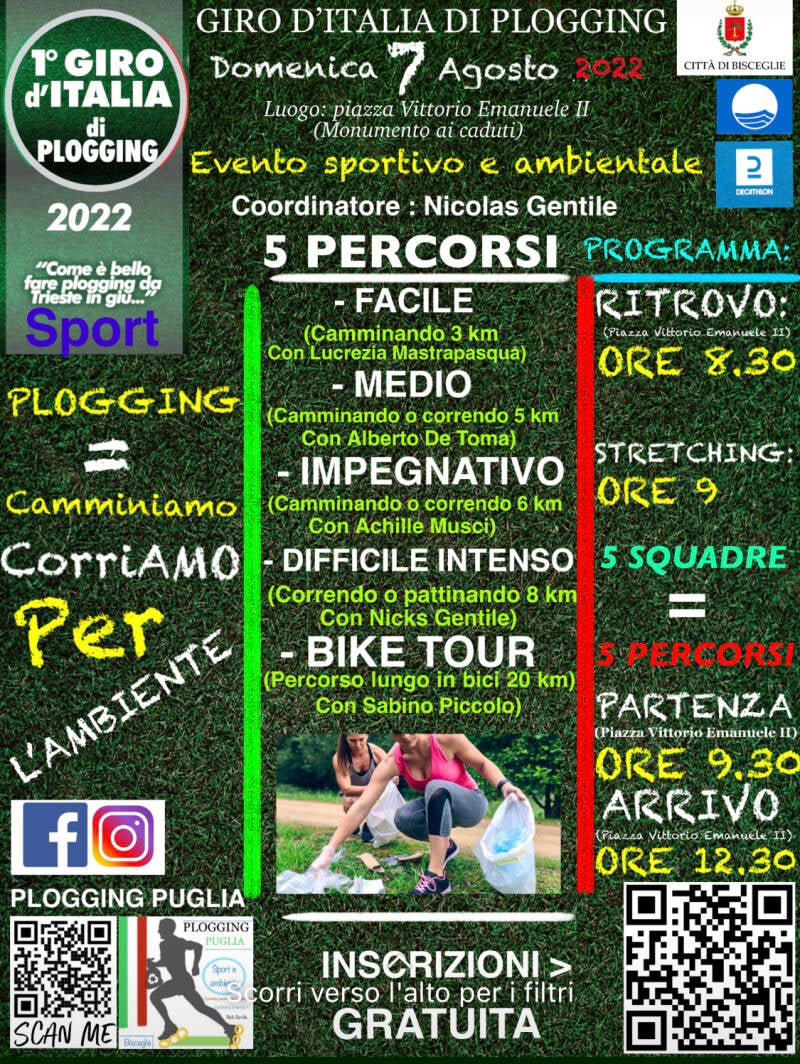 Il Giro d'Italia di Plogging dura tutto l'anno attraverso tutta la penisola ogni anno, con partenza da Pordenone e finendo a Cagliari con 50 associazioni e con 50 tappe in diverse città percorrendo dal nord al sud tutta l'Italia passando da Bisceglie in Puglia in fine agosto grazie alla nostra associazione "Plogging Puglia" e il patrocinio della città di Bisceglie.